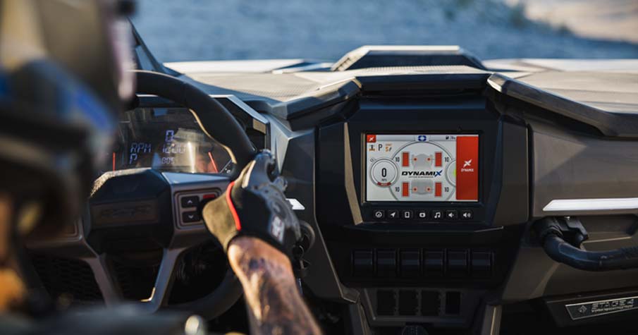 « Écran RIDE COMMANDMD de 7 po avec touche tactile résistif : Visualiseur DYNAMIX 2.0, GPS intégré, conduite en groupe (par téléphone cellulaire ou GPS), cartographie topographique, connectivité Bluetooth et USB pour téléphone intelligent, radio AM/FM et météo (haut-parleurs requis - vendus séparément), communications à bord du véhicule possibles avec casques d'écoute Sena en option, système antivol P.A.S.S. de Polaris. Cadrans analogiques à double balayage avec centre d'information du pilote à écran LCD de 4'' : Rétro-éclairage et luminosité bleu/rouge sélectionnables par l'utilisateur, intervalles d'entretien programmables. Instrumentation numérique : Indicateur de vitesse, tachymètre, compteur kilométrique, totalisateur partiel, horloge, compteur d'heures, indicateur de vitesse, jauge de carburant, température du liquide de refroidissement, voltmètre, indicateur et codes d'entretien, témoin de rappel de ceinture de sécurité, indicateur de vitesse, prise de courant continu.